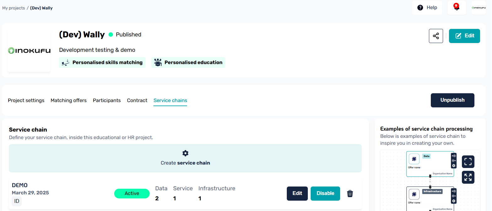 In order to create a service chain, you need to have a signed project contract which includes you as a participant and a minimum of one additionnal signed participant providing at least one offer. Essentially, you need to ensure you fit the following conditions: