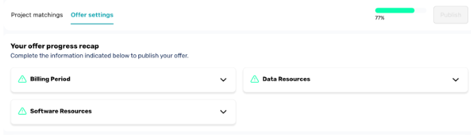 Do not neglect or forget to fill out the Offer settings tab, this is where you can indicate the policy, pricing and add resources to your offer. Without these elements, you will not be able to publish the offer on the catalogue.